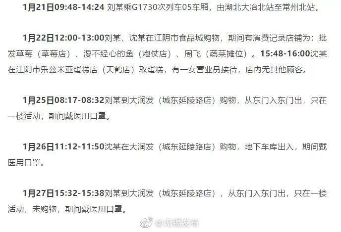 無錫江陰新型冠狀病毒感染的肺炎確診病例2劉某、病例3沈某(為病例2的兒媳),目前兩人均在市定點醫(yī)院隔離治療,病情穩(wěn)定 。在流行病學調查時,發(fā)現劉某、沈某有以下出入公共場所活動軌跡,現緊急尋找相關接觸人員。