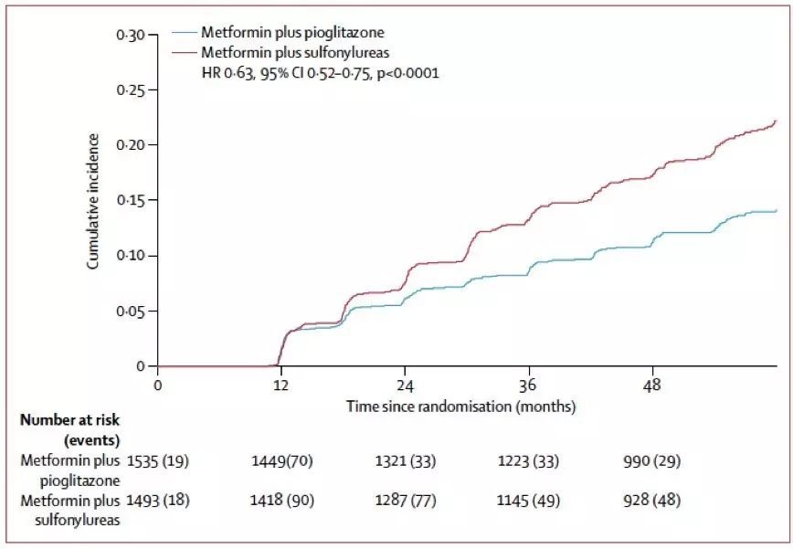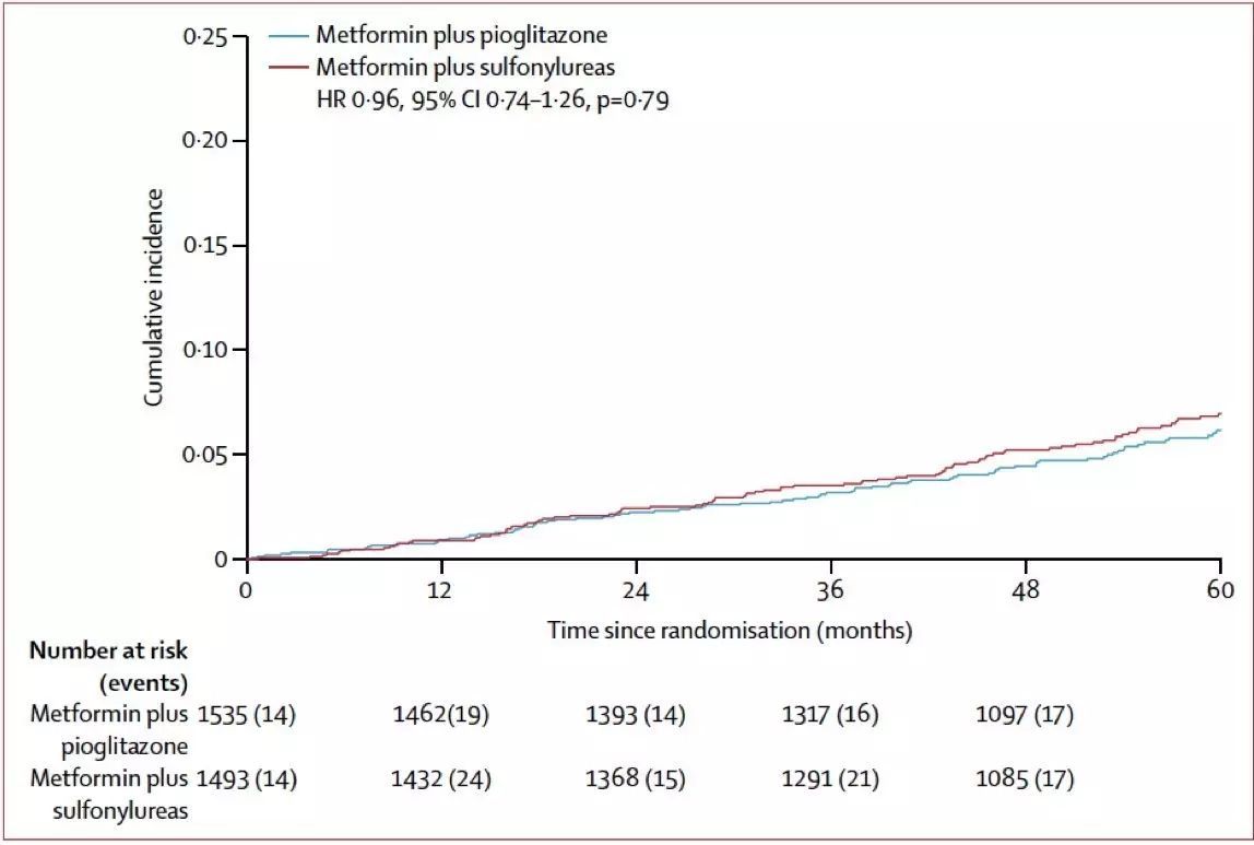 研究選取50-75歲二甲雙胍單藥控制不佳的2型糖尿病患者共3028名,平均HbA1c7.7%左右,在繼續(xù)應(yīng)用二甲雙胍的基礎(chǔ)上1:1分配至2組:吡格列酮組(15-45 mg)和磺脲類組(格列本脲5-15 mg,占2%;格列美脲2-6 mg,占48%;格列齊特30-120 mg,占50%),并進(jìn)行了平均近5年的隨訪。在隨訪中,由于受到“吡格列酮增加膀胱癌”事件風(fēng)波的影響,前組的停藥率明顯高于后組(28.1% Vs 15.9%)。