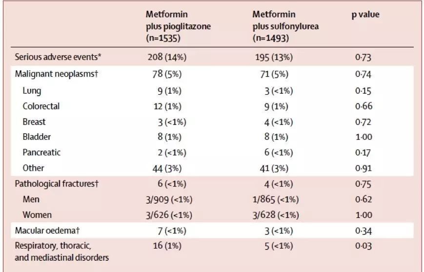 3二者骨折和腫瘤發(fā)生率(包括膀胱癌在內(nèi))無明顯差別。吡格列酮心衰事件發(fā)生率更高,但二者的差異不具有統(tǒng)計學(xué)意義。
