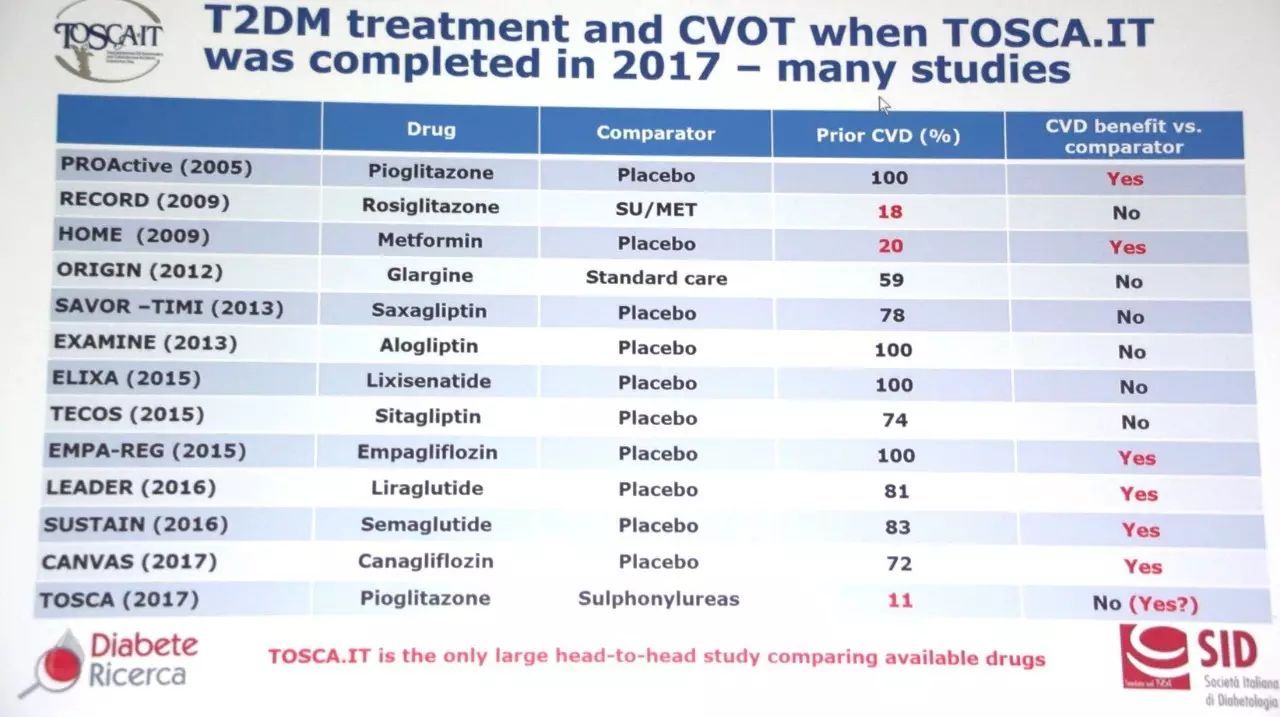 綜合迄今為止國際2型糖尿病領(lǐng)域的大型心血管結(jié)局研究,可以看到,既往研究大多數(shù)為藥物與安慰劑組的比較研究(RECORD研究除外,其應(yīng)用的羅格列酮曾因心血管風(fēng)險被禁)。TOSCA.IT是迄今為止唯一一項2種常見口服降糖藥之間頭對頭對比心血管結(jié)局的大型研究,其意義不言而喻。