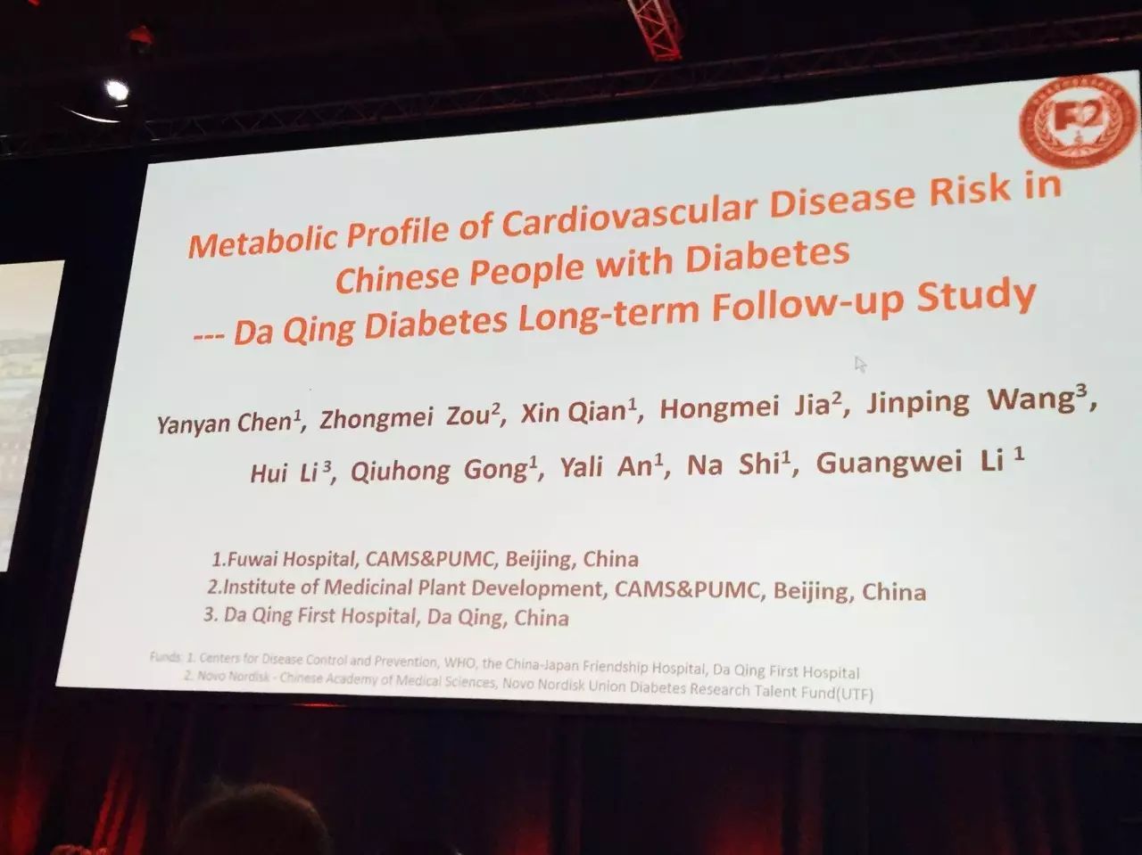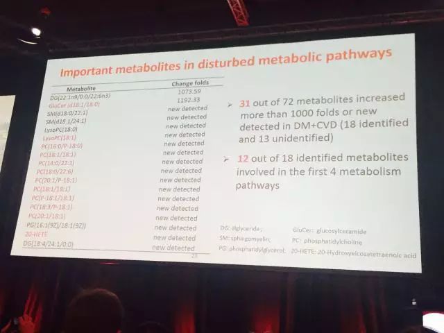 里斯本時間9月14日上午,在Fitzgerald Hall,中國醫(yī)學(xué)科學(xué)院阜外醫(yī)院陳燕燕教授代表團(tuán)隊(duì)匯報了“中國糖尿病人群心血管疾病風(fēng)險代謝特征——大慶研究長期隨訪結(jié)果”。通過對大慶研究人群進(jìn)行長期隨訪,發(fā)現(xiàn)72種代謝產(chǎn)物及8種代謝途徑與糖尿病心血管疾病相關(guān),其中18種代謝產(chǎn)物在糖尿病合并心血管疾病人群中升高超過1000倍。多變量回歸分析顯示2種代謝物(20-HETE、Palmitoyl sphingomyelin)可能是糖尿病合并心血管疾病的獨(dú)立危險因素;其中4種代謝途徑與糖尿病心血管疾病高度相關(guān)。